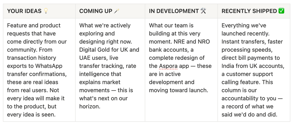 Not everything. Some work — infrastructure improvements, security upgrades, compliance work — happens in the background and doesn't appear as a named feature. We've kept the roadmap focused on what directly impacts your experience as an Aspora user.