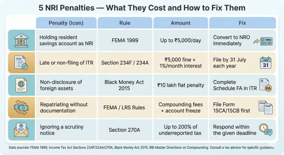 Here are the five penalties that catch NRIs off guard, what they actually cost, and exactly how to fix them.